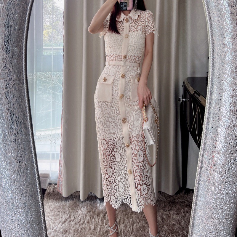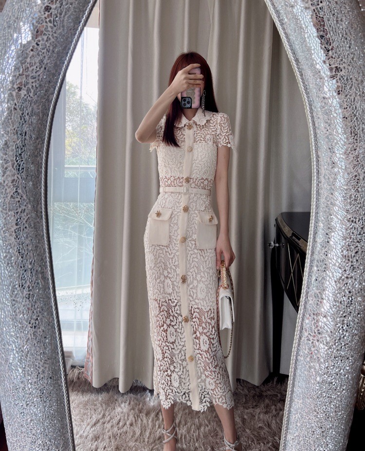 2023春夏新款女装性感小心机蕾丝中长裙翻领短袖连衣裙子米色黑色